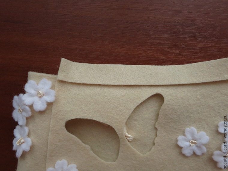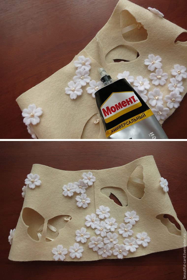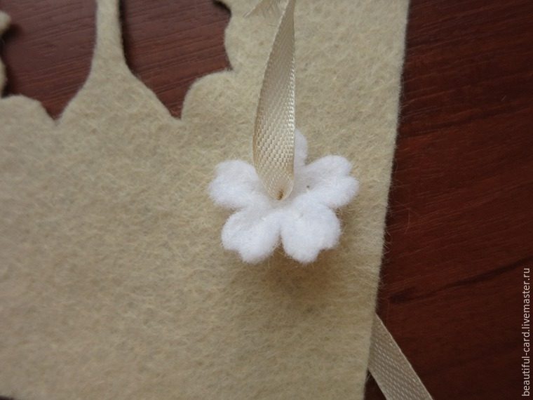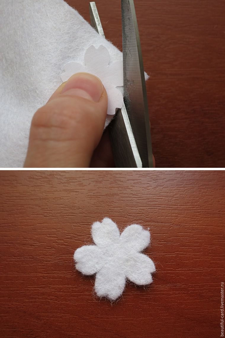 Будем делать цветочки из белого фетра. Можно пойти двумя путями: первый — вырезать цветы при помощи фигурного дырокола, второй — вырезать цветы ножницами.