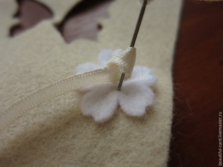 Пришиваем цветочек. Протяните иглу с ленточкой через фетровую основу и цветочек.