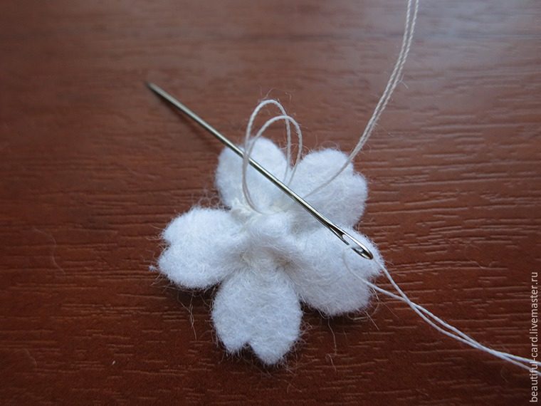 Поэтому берём иголку с белой ниткой и придаём объём нашим цветочкам. Проденьте иглу с ниткой в низ лепестка немного правее середины. Сделайте небольшой стежок, воткнув иглу на том же уровне немного левее.