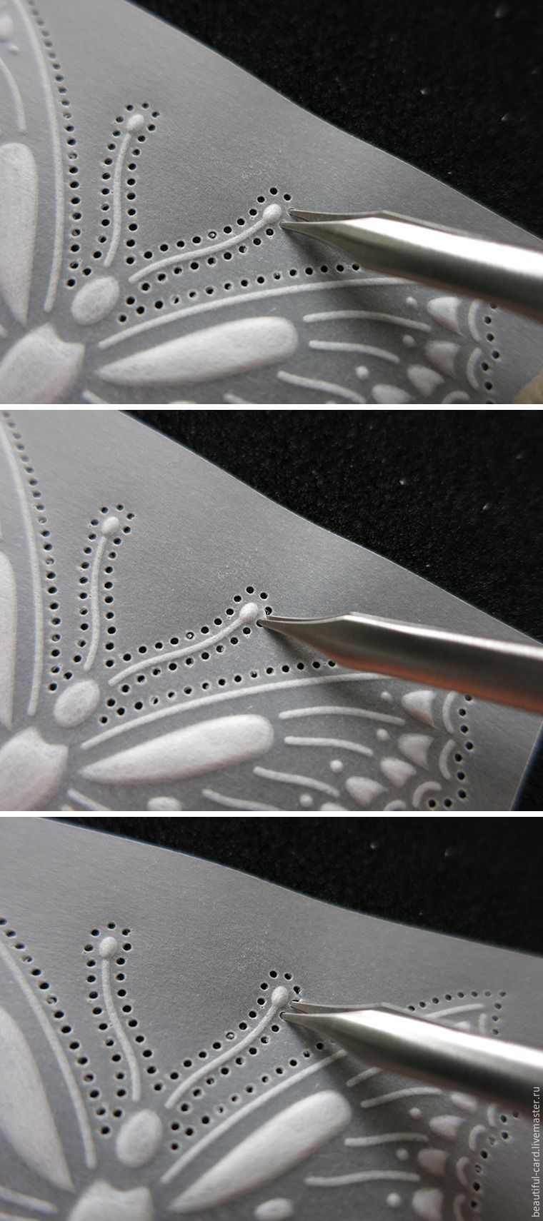 Далее берем инструмент для эмбоссирования с шариком на конце и проходимся им по кальке по всем углублениям. Эмбоссирование — это своего рода тиснение. Для тоненьких линий используйте совсем маленький шарик.