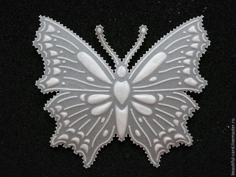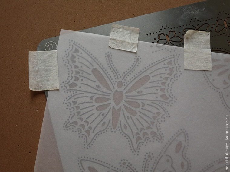 Перейдём к созданию бабочек из кальки. Для этого берем кальку и прикрепляем её при помощи малярного скотча к трафарету с бабочкой. Под низ положите коврик для эмбоссирования.