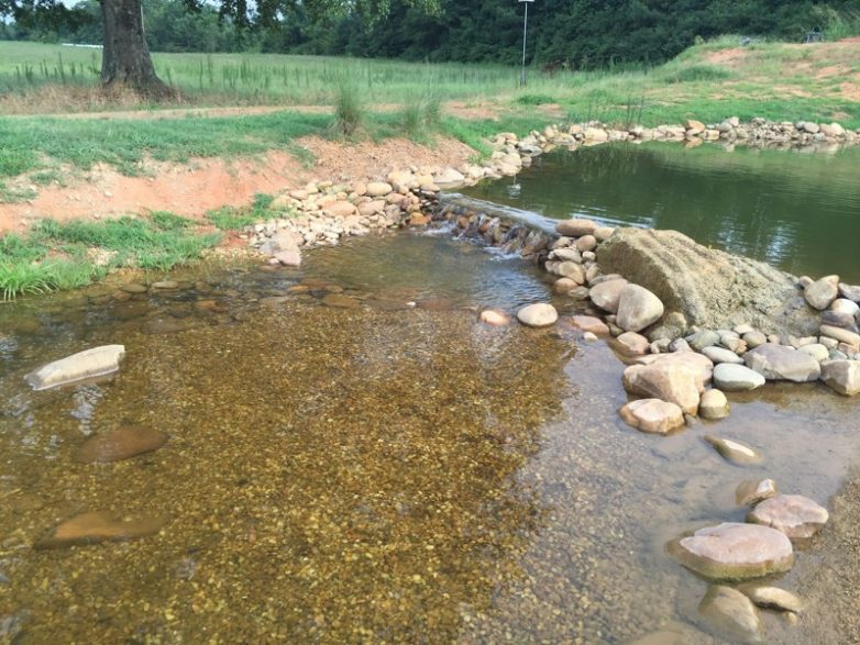Теперь в натуральной части пруда — частично галечное дно. Помимо прочего, галька служит неплохим естественным фильтром.
