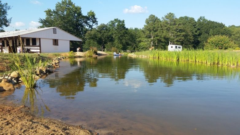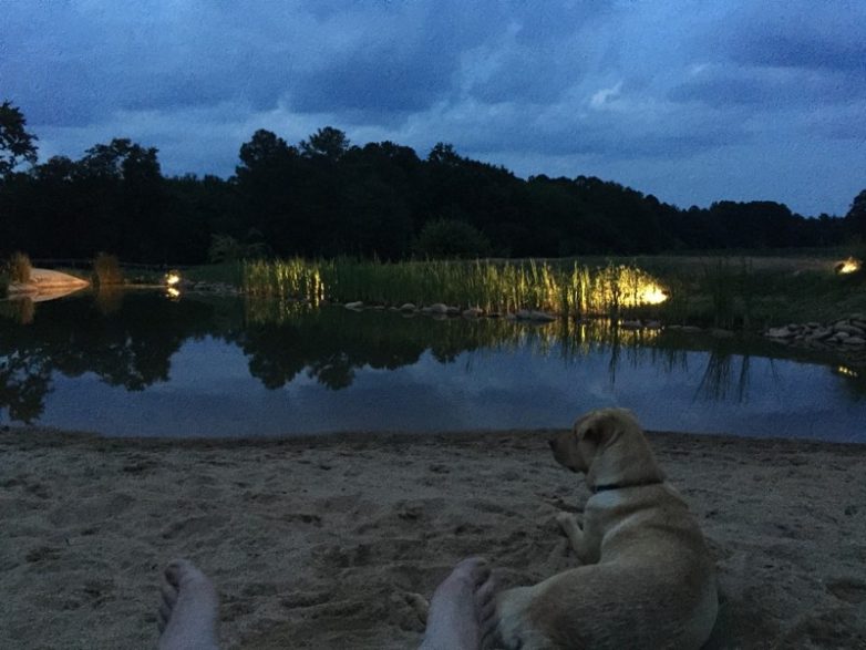 Вот такое получилось озерцо. По центру — пляж, справа — глубокая часть для купания, слева — «естественная» часть. Там уже сейчас водится рыба — окунь, солнечник, белый амур.
