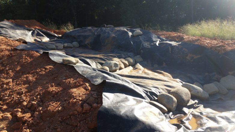 Обязательна ли ткань-фетр? В принципе, нет. Но я прикинул, что нашим жарким летом вода будет активно уходить из пруда, и решил простелить его тканью, чтобы вода терялась только за счет испарения, и не возникало необходимости постоянно доливать воду в пруд.