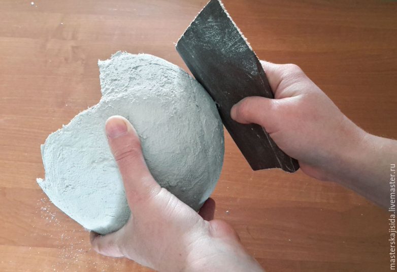 8. Берем наждачную бумагу и шлифуем поверхность яйца, убираем лишние бугорки. Но не увлекайтесь, а то можно дотереть до верхнего слоя марли и ткань будет видно.