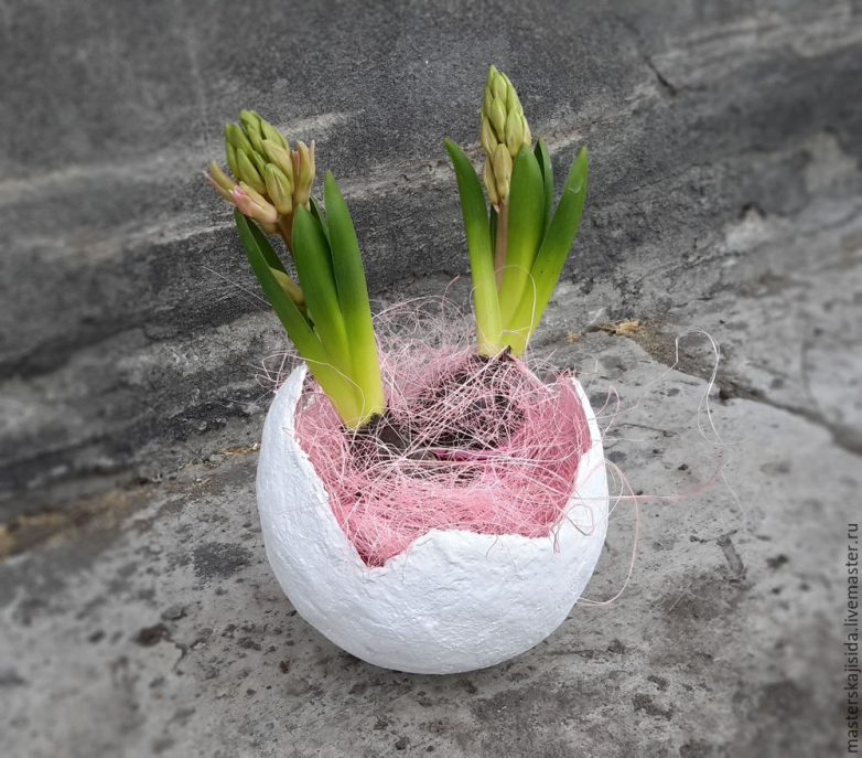 Внутрь скорлупы поставили кашпо с живыми гиацинтами и декорировали розовым сизалем. Также можно взять другие весенние цветы: нарциссы, примулу, мускари, крокусы.