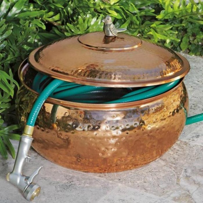 Длинный садовый шланг, тянущийся вдоль участка или лежащий в стороне, может стать причиной падения или серьезной травмы. Решить проблему поможет большой контейнер с отверстием. Для этих целей можно использовать медное кашпо, большую кастрюлю, корыто или ящик.