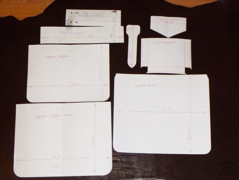 Первым делом изготавливаем выкройки. Для этого я использовал ватман. Выкройки боковой частей портфеля, переднего кармана и ремня я не делал, так как это просто прямоугольники. Ширина их может быть любая на ваше усмотрение. Длину боковушки берем с запасом на 10-14 см, для того, чтобы впоследствии сделать боковые клапаны. Если не позволяет размер кожи — делаем из двух частей. Боковая часть кармана тоже с небольшим запасом (лучше потом обрезать, чем не хватит длины).