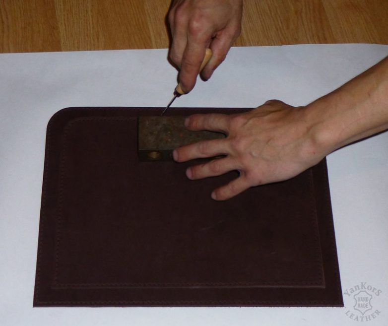 Далее размечаем шилом на передней части портфеля место пришивания кармана. Делаем это по уже вырезанному карману. На фото я прижал это дело металлическим бруском.