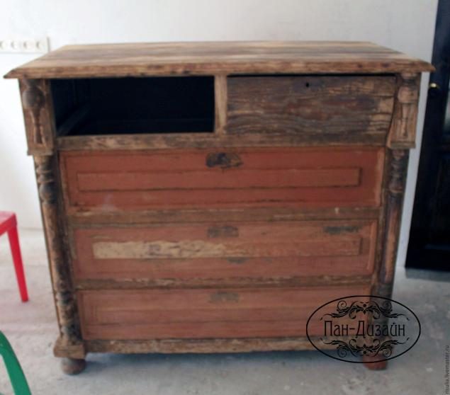 Хозяйка данного комода однажды спасла его, когда несли на помойку соседи, и она во время увидела такое безобразие, а так как она обожает всякие старые вещицы, попросила отдать его за пару бутылок.