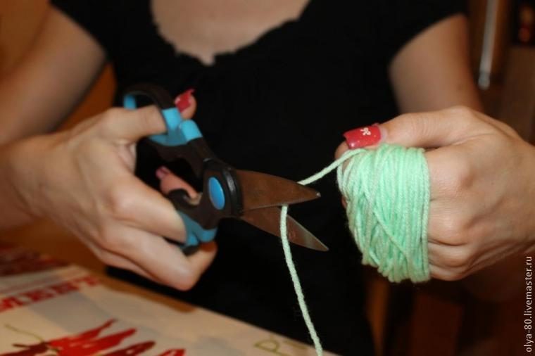 После того, как был намотан желаемой толщины будующий помпон, я отрезала его от основного клубка и завязывала посередине той же ниткой от клубка.