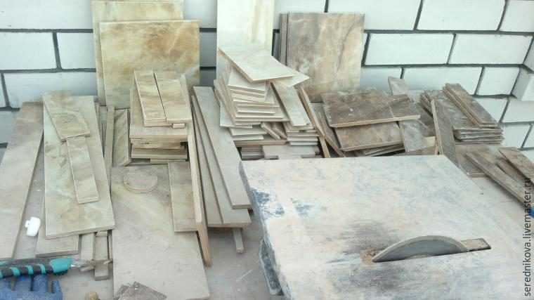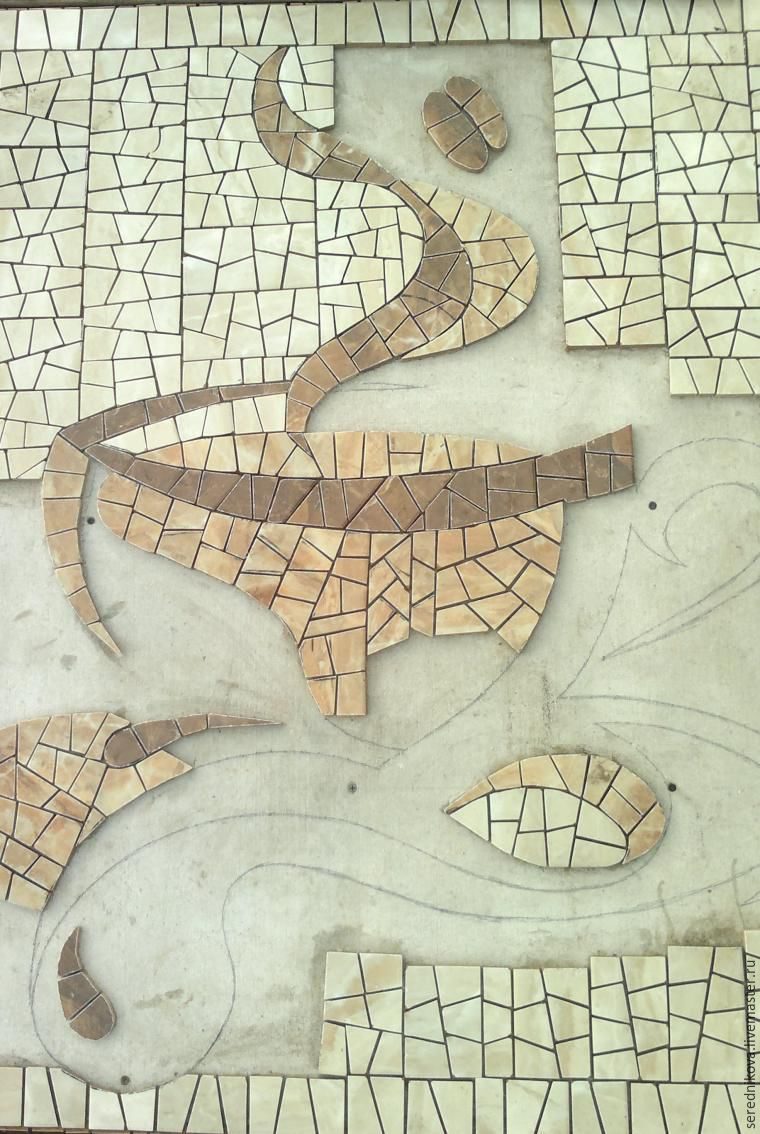 Бумажную копию чашки, после перевода картинки на стол, разрезала на фрагменты и использовала для переноса рисунка на плитку. Плитку резала небольшим электрическим плиткорезом (он виден на первом фото, на фоне плитки). Кусочки плитки к столешнице приклеивала на клей «Титан» или его аналог.