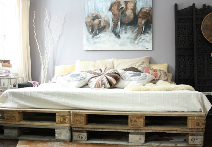 Невысокая кровать из деревянных поддонов значительно экономящая пространство.