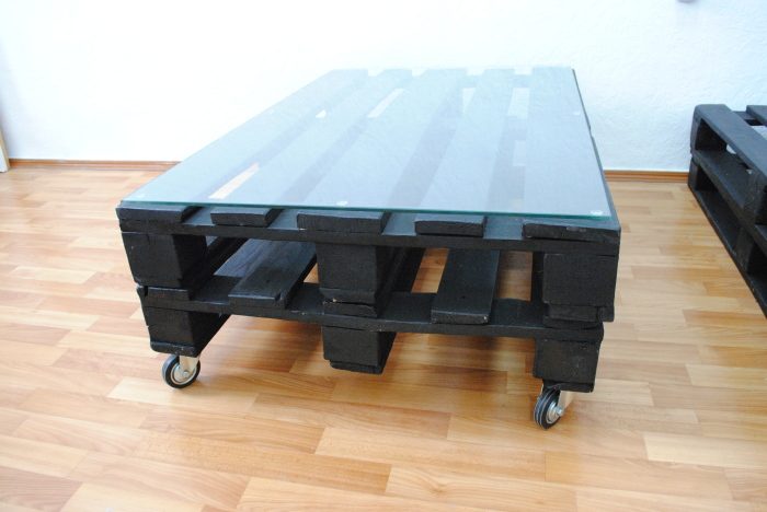 Журнальный столик из поддонов, покрашенных в черный цвет.