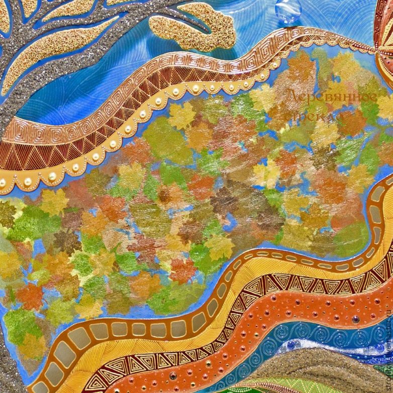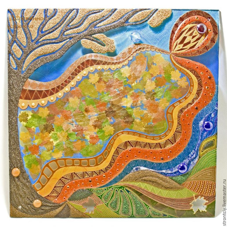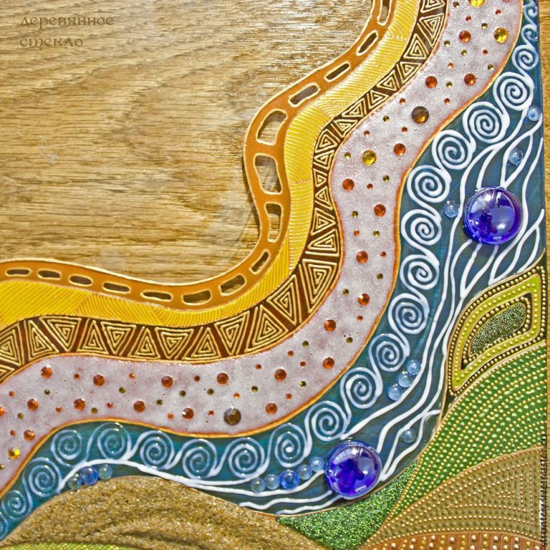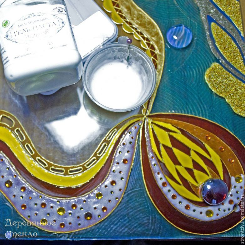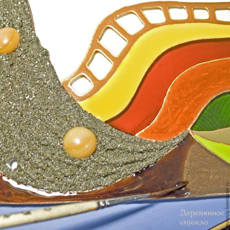 Шаг 9. Краски высохли, теперь начинаю прорабатывать контурами по стеклу каждый сегмент панно, согласно задумке. Кое-где узоры меняются в зависимости от текущего порыва фантазии. В некоторых местах использую для украшения полубусины — их клею на прозрачную витражную краску и через минутку-две уже продолжаю работу контуром. Секторы «земли» в нижней части панно выложила песком и микробисером, придала объем. Одну из линий солнца — оранжевую — мне также захотелось сделать объемной. Выложила её стразами разных размеров, поверх нанесла слегка разведенную водой до консистенции сметаны «ледяную» гель-пасту для стекла. Через сутки она высохнет и станет прозрачной, придавая линии интересный эффект.