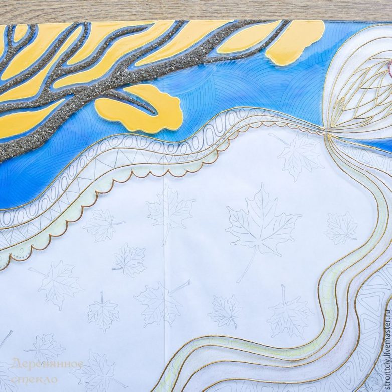 Шаг 6. Приступаю к росписи неба и воды. Прозрачным контуром наношу на обезжиренную поверхность всего «небесного» сегмента параллельные линии, согласно задумке. После полного высыхания линии станут прозрачными и будут интересно выделяться сквозь витражную краску. Через три — четыре часа заливаю этот сегмент прямо поверх прозрачных линий темно-голубой витражной краской. Тем же прозрачным контуром наношу узоры в нижней части панно, где будет «водопад». А пока контур сохнет, можно «нарисовать» листья дереву.