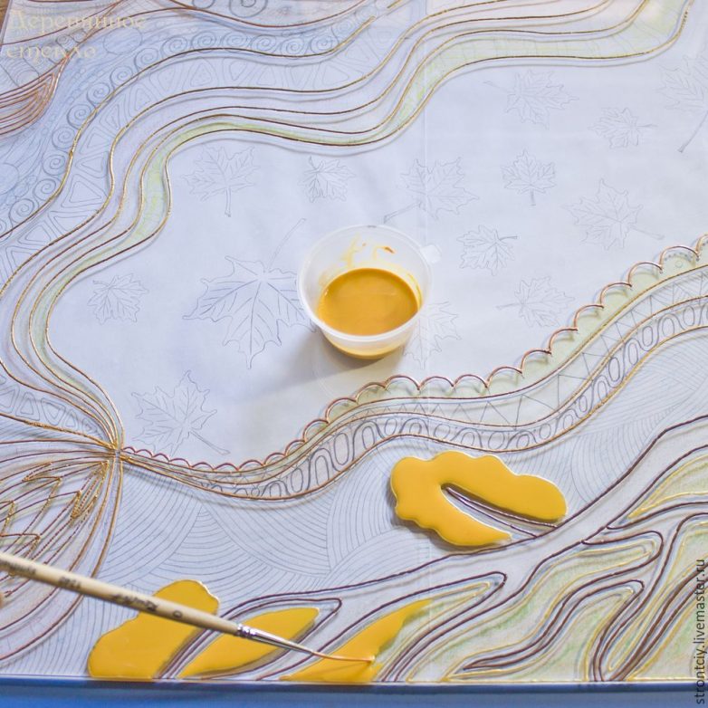 Шаг 4. Закончив нанесение основных линий, начинаю работу с дерева, так как оно по задумке будет самым объемным, и поэтому ему потребуется время, чтобы успеть хорошенько просохнуть. Развожу витражную краску нужного оттенка и прописываю подложку для листвы. Если не сделать подложку, то впоследствии при нанесении микробисера есть вероятность получить дыры и «залысины» в секторах.