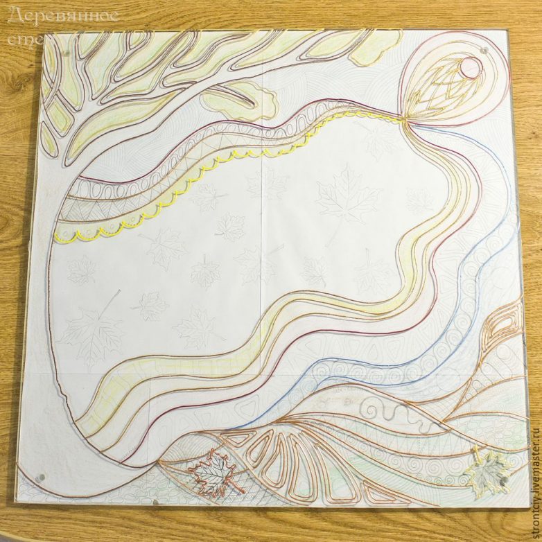 Шаг 1. Делаю набросок эскиза будущего панно в своей рабочей тетради, потом переношу на склеенные до нужного размера листы обычной офисной бумаги. После чернового наброска простым карандашом и проработки более мелких деталей, цветными восковыми мелками определяю основные цветовые зоны эскиза.