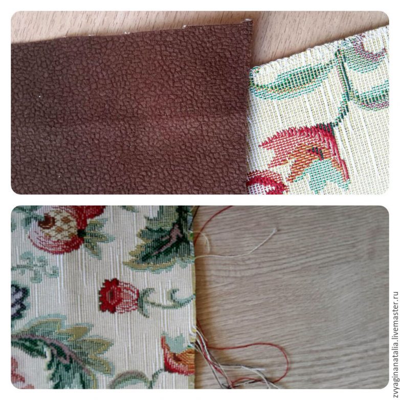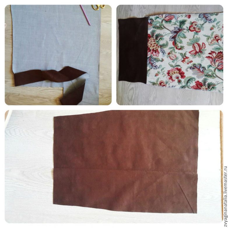 Спинку раскраиваю сразу на ткани. Только заднюю часть делаю из двух тканей, а переднюю — просто коричневой.