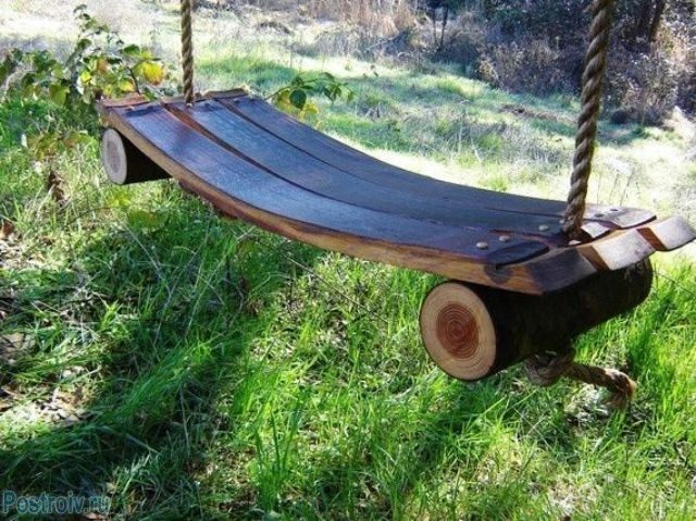 Садовые качели простой формы.Доска с четырьмя отверстиями — основа для изготовления простых садовых качелей своими руками. Также понадобится крепкая веревка. Чтобы дерево прослужило долгое время, не забудьте обработать его защитными пропитками или покрыть лаком. Так деревянным качелям будут не страшны перепады температуры и влажности.