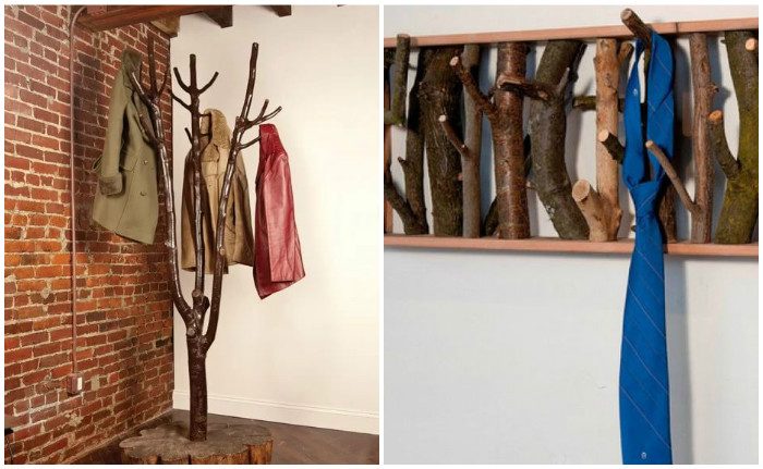 Из веток разной длины получится сделать самые разные вешалки и крючки. Из небольшого ствола получится вешалка для прихожей, а их маленьких, закрепленных внутри глубокой рамы — для ванной комнаты. Чтобы вещи не цеплялись за дерево, нужно снять с него кору, покрыть лаком или краской.