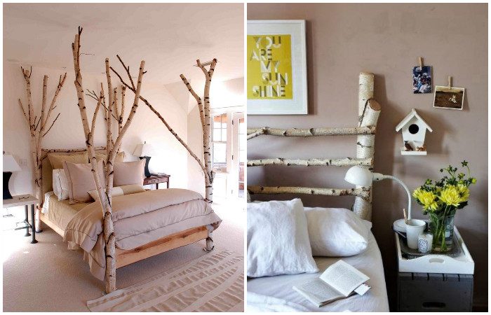 Деревянное изголовье кровати своими руками.Красивое изголовье — бюджетный вариант украшния спальни, который не отнимет драгоценную площадь. Вариантов размещения веток может быть множество. Например, они размещаются по углам кровати или же только за изголовьем. Чтобы такая композиция прослужила долго, рекомендуется дерево покрыть лаком.