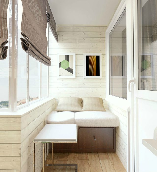 Светлый балкон, обшитый пластиком, с лаконичным светлым диванчиком и небольшим мобильным столиком — прекрасный пример грамотного использования пространства городской квартиры.