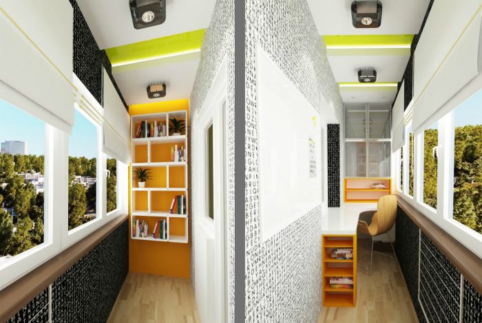 Потрясающий дизайн узкой лоджии с оригинальной отделкой стен, современным угловым столом, книжной полкой и обилием ярких акцентов оранжевого и зеленого цвета, которые делают это пространство стильным и жизнерадостным.