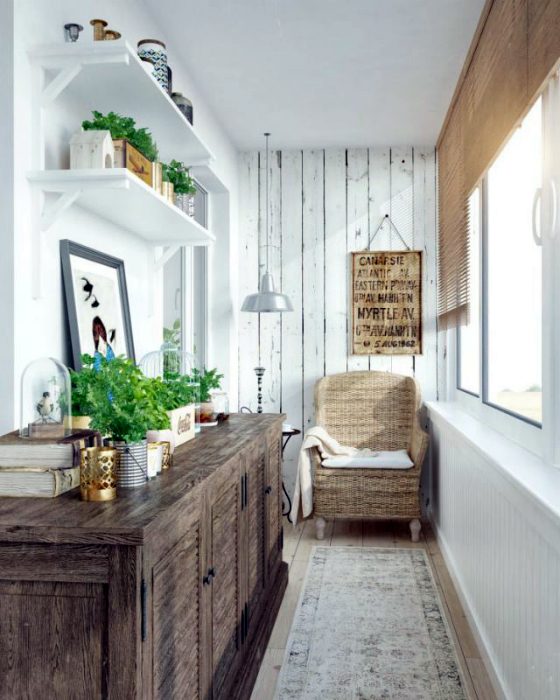 Узкая лоджия с искусственно состаренной деревянной отделкой, винтажными тумбами, комфортным плетеным креслом и обилием грамотно-подобранного декора, с помощью которых удалось создать атмосферу домашнего уюта и тепла.
