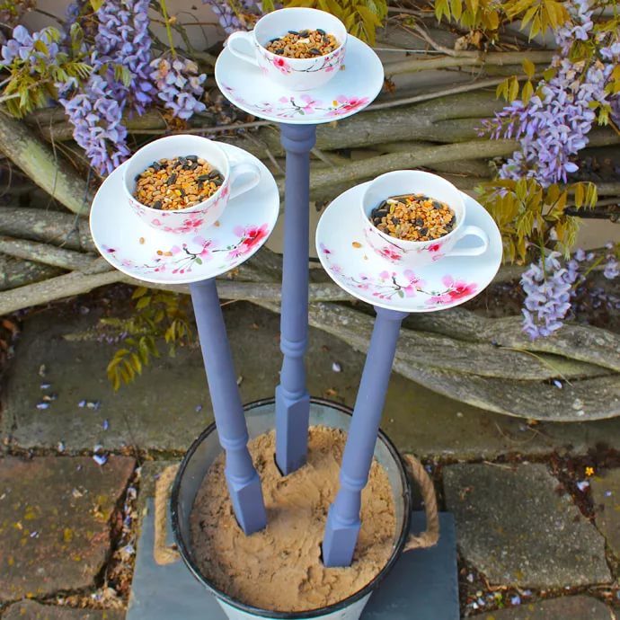 Пение птиц на приусадебном участке — что может быть приятнее? Привлечь пернатых поможет декор для дачи из старых вещей: кормушка из блюдец и чашек. Также понадобятся деревянные ножки от мебели. Предметы можно склеить при помощи силиконового строительного клея. Такая кормушка еще и станет оригинальным декором для клумбы.