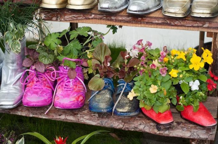 Несколько пар старой обуви заменят цветочные горшки. Если необычно обуви не нашлось, то покройте акриловой краской любую пару. Для того чтобы растений не загнила коревая система, проделайте в подошве несколько отверстий. Это необходимо для отвода лишней воды.