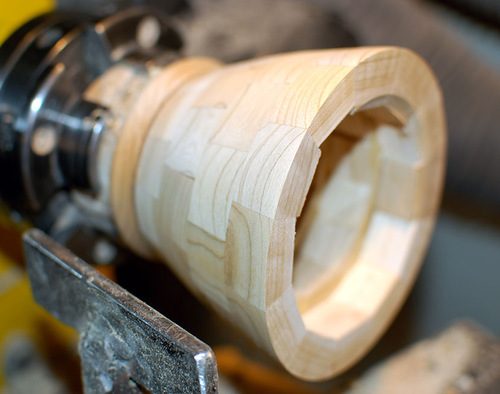 Обточив кольцо с орнаментом, приклеиваем вторую, предварительно склееную из оставшихся колец, часть «пирога» и тоже обтачиваем сначала снаружи, а потом внутри.