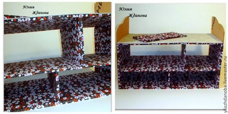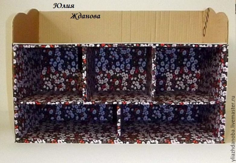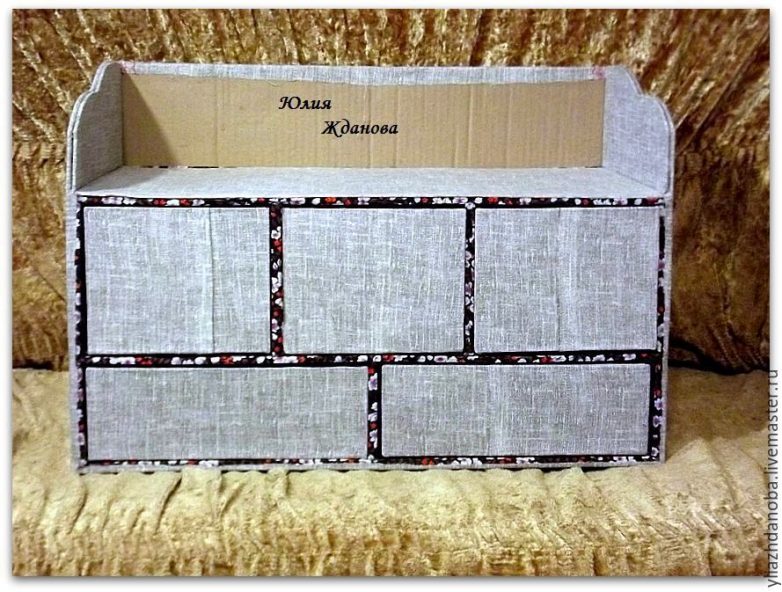 На заднюю стенку приклеила дополнительную панель из двойной гофры, на нее будет опираться верхняя полка, эту панель обтянула бязью.
