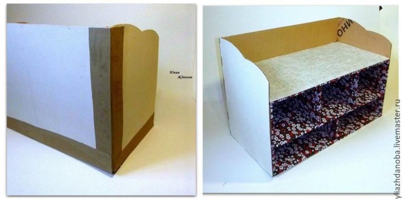 Затем под полочки, на которых будут стоять ящики, я вырезаю из плотного двойного гофрокартона дополнительные боковины (если у вас нет двойной гофры, то склейте два листа гофры между собой), по высоте они равны будущим ящикам, между боковинами делаю разрыв в 0,7 см — это толщина полочки, когда они просохнут, обклеиваю их бязью.