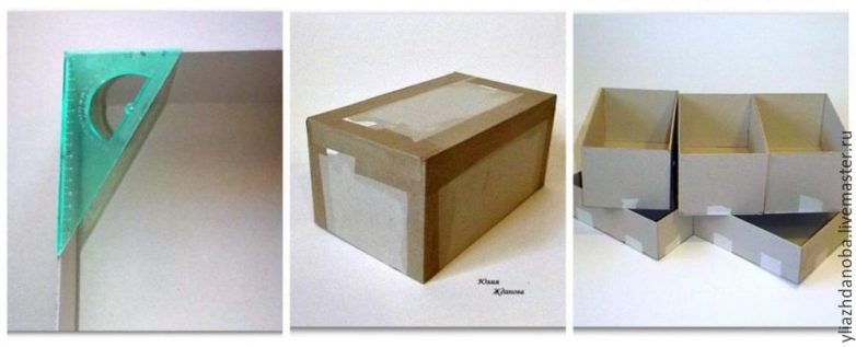 Склеивала их из переплетного картона — клеем Момент Кристалл, самое главное, выдержать угол, когда приклеиваетя дно у ящика. После высыхания все углы проклеиваю крафт-бумагой и клеем Момент Столяр.
