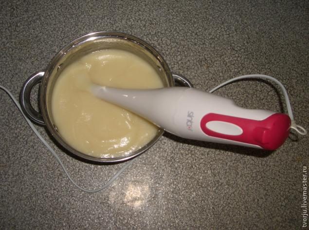 11. Затем взбиваем блендером до состояния «след», когда масса станет густой настолько, что на поверхности будет оставаться неисчезающий след от блендера.