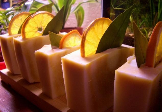 12. Добавляем в массу соль и эфирные масла, быстро размешиваем. Накладываем ложкой немного в форму, затем посыпаем поверхность апельсиновой цедрой. Снова выкладываем слой массы и снова посыпаем. Повторяем, пока не закончится мыльная масса. Втыкаем сверху засушенный ломтик апельсина. И ставим застывать. Сначала масса будет нагреваться и станет более жидкой и гелеобразной, но постепенно остынет и затвердеет. Когда это произойдёт, нужно вынуть мыло из формы и порезать на куски. Но пользоваться им будет можно через полтора – два месяца, когда оно «созреет».