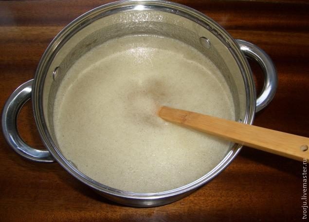 10. С помощью термометра определяем температуру растопленных заранее масел и раствора щёлочи. Она должна быть одинаковой. Аккуратно тонкой струйкой через ситечко вливаем щёлочь в растопленные масла и размешиваем деревянной ложкой.