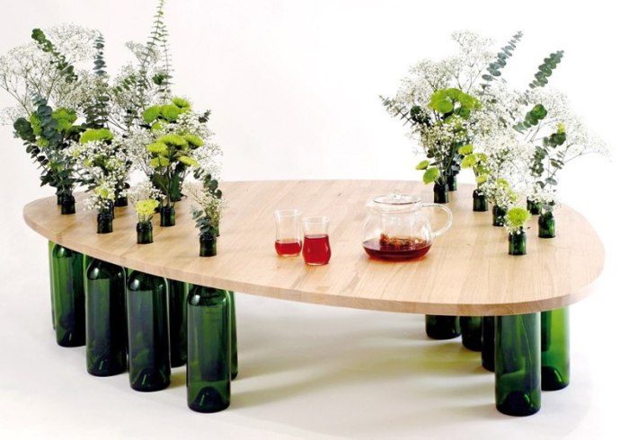 Отрезок фанеры с отверстиями, соответствующими размеру бутылочных горлышек, и сами бутылки — это все, что понадобится для того, чтобы смастерить журнальный столик.