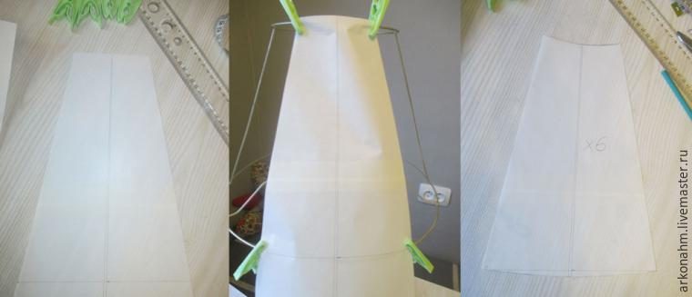 Теперь надо сделать выкройку. Еще раз чертим трапецию. Верхний и нижний край необходимо скруглить. Чтобы не заниматься мучительными математическими расчетами и геометрическими построениями, я поступаю так: бельевыми прищепками прикрепдяю бумажную заготовку к каркасу, карандашом аккуратно без нажима прорисовываю верхнюю и нижнюю линии, снимаю, рисую пожирнее. Можно вырезать и кроить.