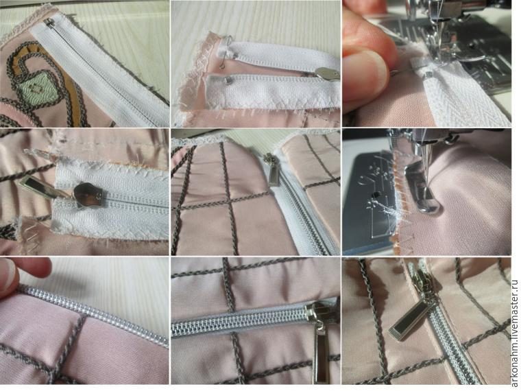 Еще один секрет как быстро и просто втачать молнию: сначала нужно зигзагом (или прямой строчкой, зависит от основы) стачать край тесьмы молнии и срез основы. Это впоследствии не даст молнии «гулять» при прокладывании строчки вдоль зубцов. Затем меняем лапку на специальную. Прокладываем строчку по изнаночной стороне вплотную к зубцам контролируя, чтобы срез шел по ризке на машине. И затем по лицу отделочная строчка. Никаких приметок и только одна булавочка.