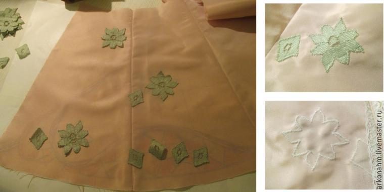 Начинаем вырезать части аппликации. Детали из гипюра вырезаем просто по контуру. Накладываем на основу, подложив эскиз — фломастер просвечивает сквозь материал основы и можно выложить рисунок не перенося ничего на материал. Пристрачиваем мелким зигзагом (ширина не более 2 мм).