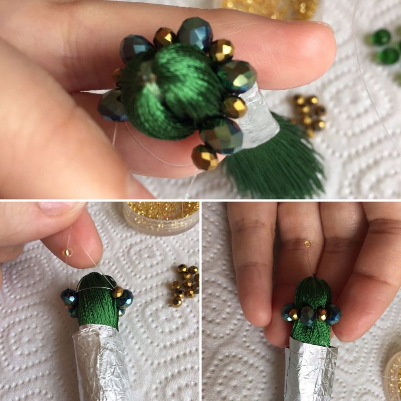 Теперь одеваем это «колечко» из ронлелей на кисточку, затягиваем и завязываем на 2 узла. Для удобства я накручиваю на кисточку фольгу, чтоб было удобнее держать, так как кисточка очень мягкая :)