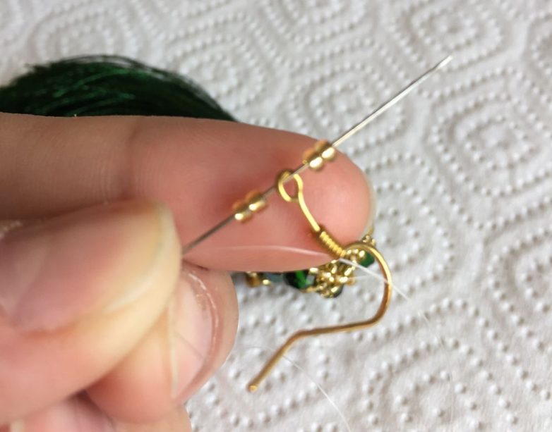 Теперь проходим иглой вверх через 3 бисерины и рондель.