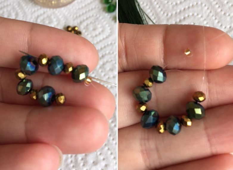 Набираем 6 мм рондели и проходим между 4 мм как в верхнем ряду, затягиваем и проходим леской по кругу для крепкости.