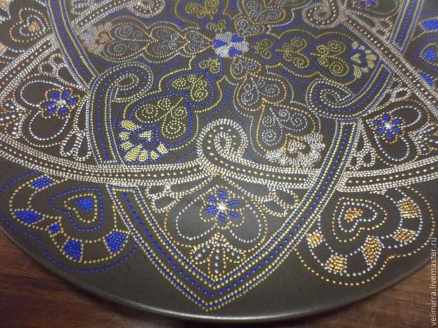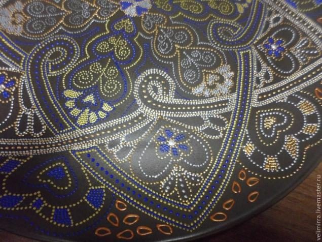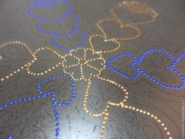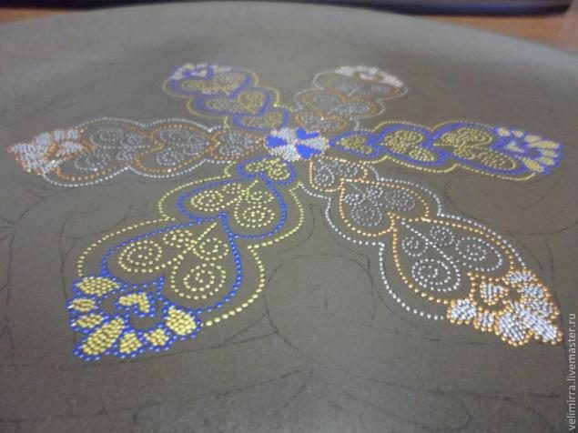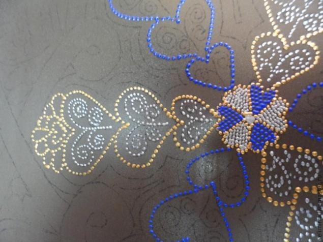 По аналогии с бронзовым контуром наносим контур синий. После создания серединной основы остановимся и посмотрим все ли устраивает. Если нет, то острым краем зубочистки можно убрать не понравившиеся точки (делать это можно только тогда, когда точки свежие). Если контур высох, то можно убрать линии ватной палочкой, смоченной в спирте или ацетоне (вода оставляет след)