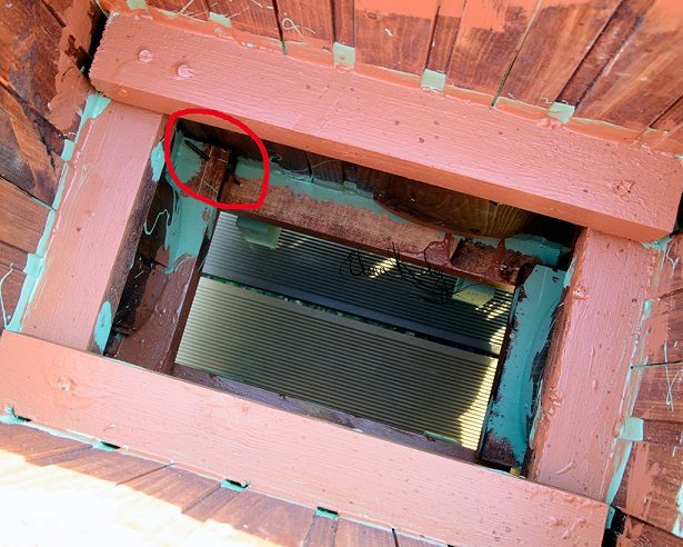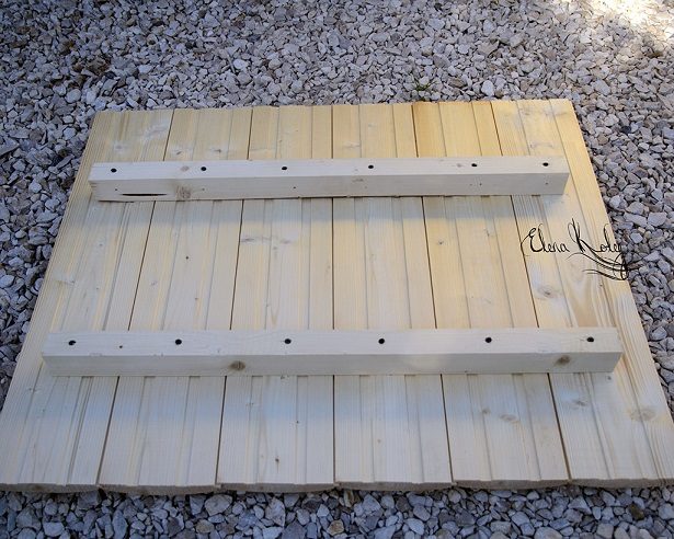 С внутренней стороны саморезами крепим все наши доски бруском (дополнительно скрепили доски небольшими отрезками — остатками блок-хауса, видно на фото, где уже покрасили).