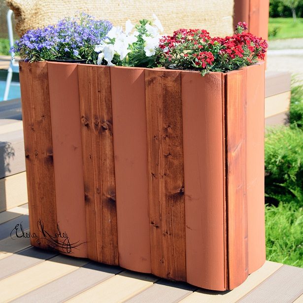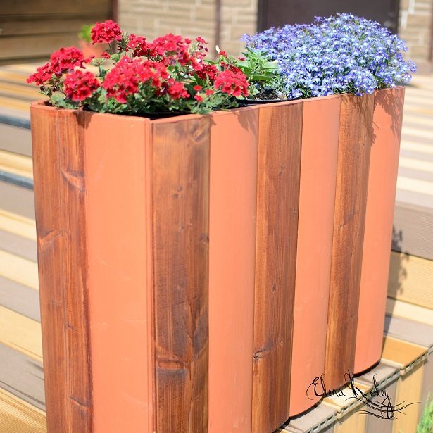 Далее красим наши вазоны снаружи. Красим поочередно: лазурью и краской. Лазурь имеет тройное действие: защищает, пропитывает и украшает древесину (эффект обжига). Можно все покрасить лазурью, тоже будет красиво, но мы выбрали полоску, так как терраса у нас полосатая (а краску мы подобрали в тон нашей крыши).