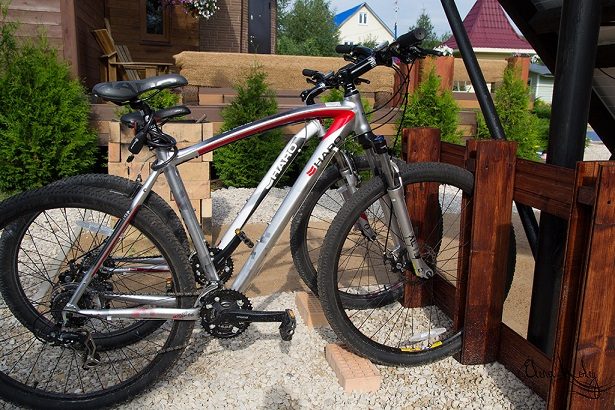 Из оставшейся доски муж сделал оригинальную подставку для велосипедов (покрасили лазурью в три слоя). Получилась оригинальная стоянка для железных коней :)