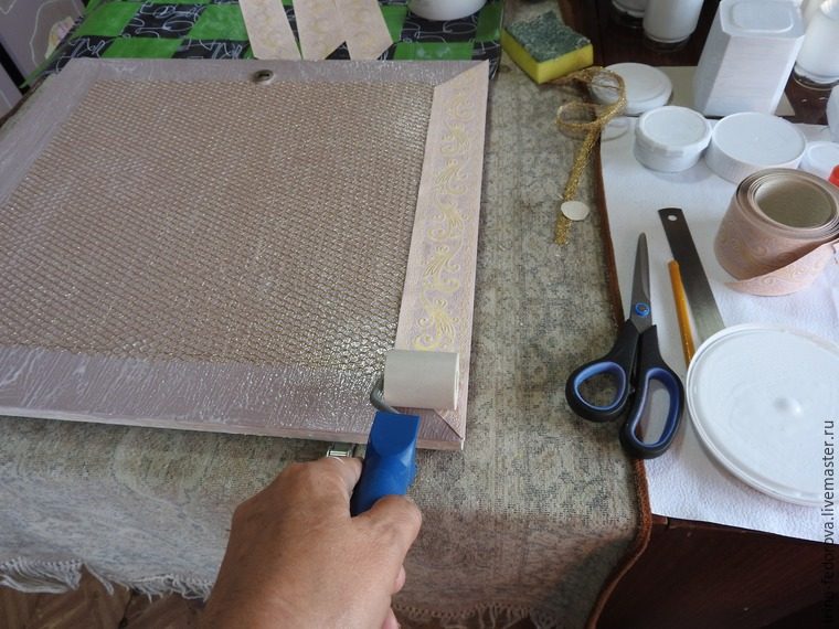 9. На границе сетка — бордюр, я решила наклеить недорогой я бы сказала дешовый декор. Покрасила его под золото акриловой краской и приклеила на супер клей «Мастер кляин». Выдержала часа 4-5 и нанесла завершающий слой (уже пятый) акрилового лака.